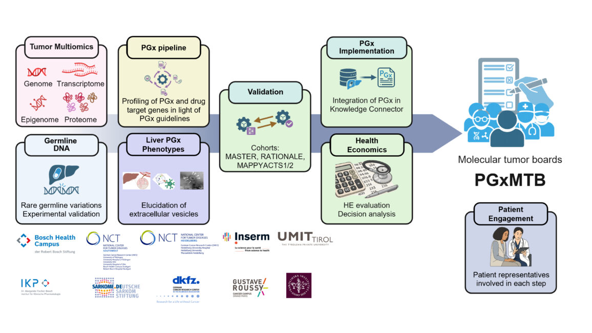 Personalised oncology has led to the development of drugs tailored to specific genetic variants. However, the full potential of targeted treatments remains untapped, largely because current approaches focus predominantly on acquired, tumour-specific alterations. Yet adverse drug reactions affecting organ systems are typically influenced by the patient’s germline rather than the tumour genome. To realise the full potential of personalised therapy, cancer care must therefore integrate pharmacogenomic (PGx) principles alongside tumour-informed strategies. PGxMTB accomplishes this mission by implementing PGx into molecular tumour boards (MTBs). Specifically, existing data from two nationwide precision oncology initiatives (DKFZ/NCT/DKTK MASTER, MAPPYACTS1/2) will be leveraged. Such implementations rely on validated computational pipelines that integrate germline PGx analysis with tumour-derived data. Building on this, a prototypic bioinformatics PGx pipeline will be refined by integrating over 300 pharmacogenes relevant for cancer and supportive care medicines. Health economic assessments will evaluate PGx implementation across different healthcare systems. In addition, the consortium aims to comprehensively map the PGx landscape in cancers. Tumour entity-specific PGx expression patterns and multiomics profiles will be analysed to uncover novel somatic PGx information, complemented by drug response data. Tumour-related changes in individual liver PGx phenotypes will be monitored using innovative liquid biopsy approaches that analyse liver-derived extracellular vesicles from cancer patients. PGxMTB brings together experts in basic and clinical PGx, precision oncology, bioinformatics, computational science, health economics, and patient engagement. Patient representatives will participate as research partners at all levels. Collectively, PGxMTB is expected to advance PGx-driven precision cancer medicine and improve patient outcomes.