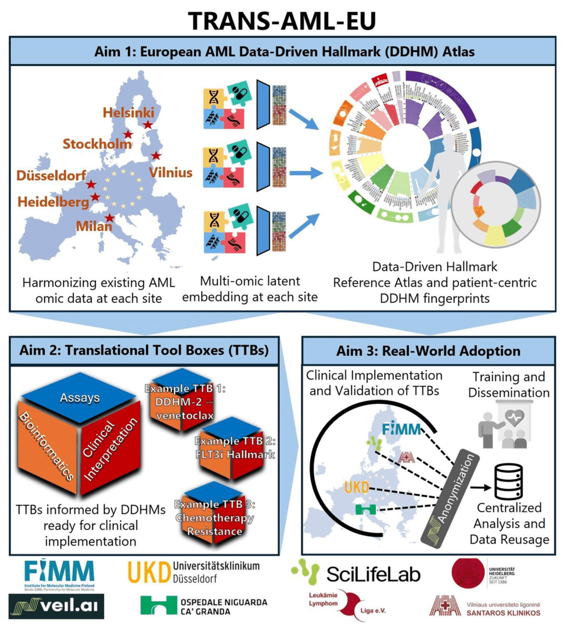 Retrospective outcome analyses and a prospective, multicenter “clinical trial in a dish” will benchmark TTB predictions against clinical and ex vivo responses. Patient and family perspectives are integrated through active involvement of the Leukämie Lymphom Liga. Ultimately, TRANS-AML-EU seeks to establish a transferable framework for hallmark-based pharmacogenomics that can be extended beyond AML to other cancers and diseases.
