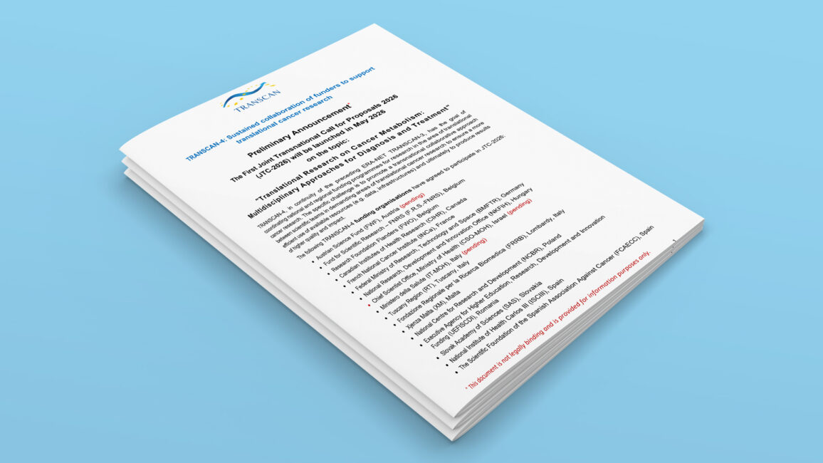 The TRANSCAN project has pre-announced its JTC2026, focusing on ‘Translational Research on Cancer Metabolism: Multidisciplinary Approaches for Diagnosis and Treatment’. The call will launch on 20 May 2026. Pre-proposals must be submitted by 21 July 2026.