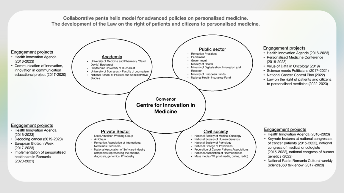 This best practice example discusses Romania’s groundbreaking law, the first in the world to recognise the right of citizens and patients to personalised medicine. Initiated following the EU Council’s 2015 personalised medicine policy, the law is the result of a multi-sectoral collaboration led by the Centre for Innovation in Medicine in Romania, using a quadruple helix model (later developed into a penta helix) involving the academia, public, private and civil society sectors. The law, promulgated on 24 May 2023, gives patients a legal right to personalised health care in a manner that takes into account individual genetic and phenotypic characteristics.
